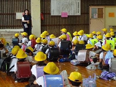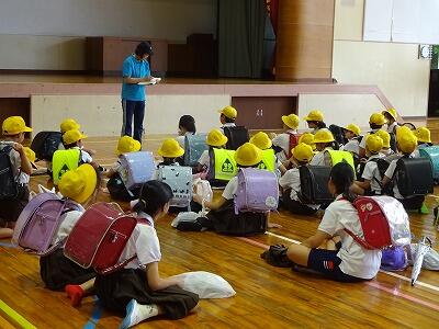 本日ラストの取組は、風水害時を想定した「緊急集団下校」です。4校時終了あたりから、強い雨が降り出し、雷の大きな音も聞こえ始めました。風水害のイメージも高まったところで、給食終了後、地区ごとに集合し、担当から風水害時の注意点等の話を聞いて、集団下校を行いました。(この時点で雨、雷はおさまっていました)