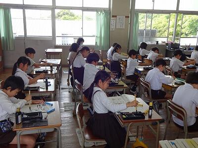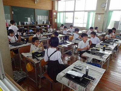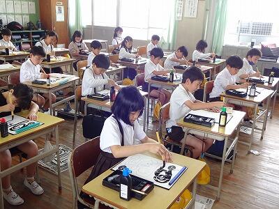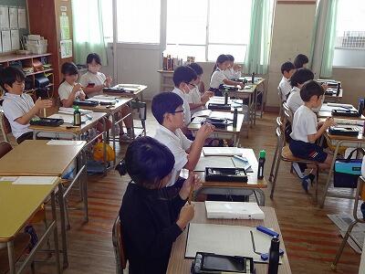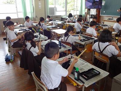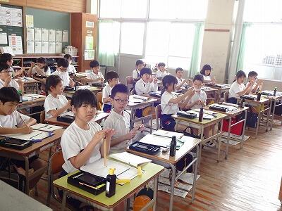 5月8日(水)3校時、3年生は真新しい習字道具セットを使っての毛筆の学習のスタートです。筆、すずり、下敷きなどの道具の準備の仕方や筆や墨汁の使い方について学習していました。筆を使っていろいろな線をなぞることにも挑戦していました。鉛筆とは違った感覚で文字を書く楽しさやそのよさをこれから味わっていってほしいです。