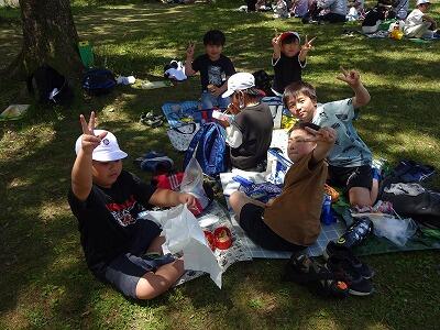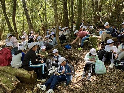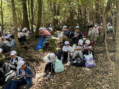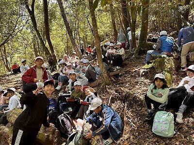 12時30分、5年生の子どもたちはむかばき山9合目で昼食お弁当タイムです。みんな元気にがんばっています。弁当を食べたら、頂上を目指してラストスパートです。