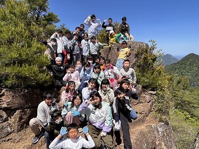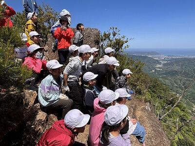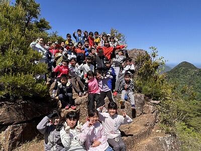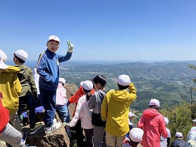 無事にむかばき山頂上に到着です。山頂からの絶景を見て、疲れも吹き飛んだことと思います。自然の家からの「ヤッホーコール」が頂上まで聞こえたことに、みんな大感動でした。