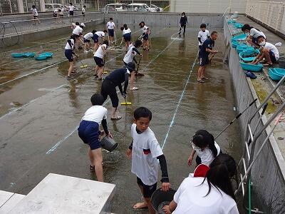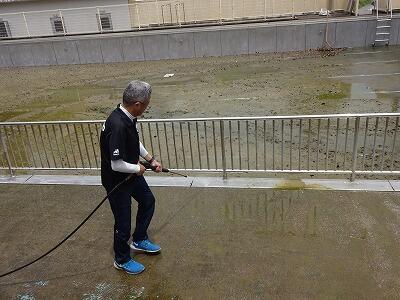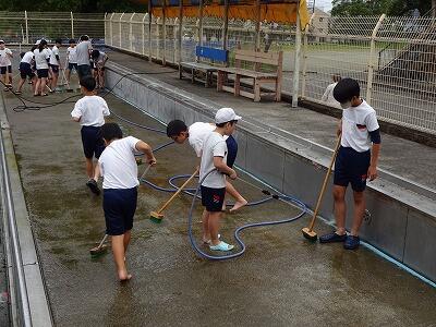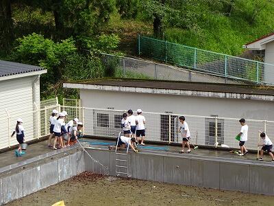 5月24日(金)プールそうじをしました。まず1・2校時に5年生が全員でプールの周りをきれいにしてくれました。枯れ葉がたくさん落ちていて大変だったと思いますが、一生懸命にがんばってくれました。5年生の作業終了後、教頭先生が高圧洗浄機で浅い方のプールを中心にそうじをしました。その後、6年生が作業を引き継いでプールの壁面や底をきれいにしてくれました。びしょ濡れになりながらも、がんばってくれました。そして最後の仕上げを職員で行いました。みなさん、おつかれさまでした。