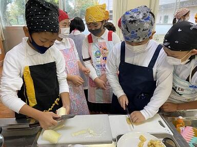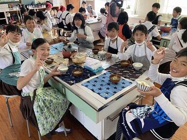 5年生は、そのお米を使って、1学期できていなかった家庭科でご飯と味噌汁の調理実習を行いました。みんなで協力してご飯を炊いたり味噌汁を沸かして食べました。採れたての新米はとてもおいしかったです。