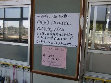 3年生の教室の廊下には、珍客(珍しいお客様)がやってきました。その正体は・・・「アオリイカ」と「オニカマス」の子どもです。これは、3年の担任の先生が細島の海ですくってきたそうです。