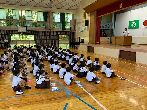 校長先生が、「1学期に平成から令和へと変わり、新しい時代が始まりました。富高小学校も新しい校舎ができ、記念式典では皆さんがすばらしい発表をしました。」と話されました。また、「1学期に頑張ったことが、通知表に書かれています。おうちの人と一緒に振り返ってください。そして、夏休みの目標を立てて、いろんなことにチャレンジしてください。一番お願いしたいことは、2学期の始業の日に元気で笑顔いっぱいのみなさんと会えることです。病気、けがのない楽しい夏休みを過ごしてください。」と話されました。