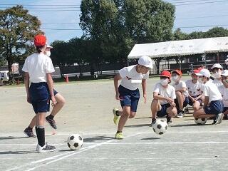 5年生では、コロナ禍の中、密にならないようにして、いっぱい体を動かしたり競い合ったりできるために、いろいろな道具を使って体つくりの運動をしています。ボールを床に思い切り突いて、自分の後ろの人のボールを手でキャッチする運動、マットを2人で運んで折り返す体の動きを高める運動、寝転がって足でボールを次の人に受け渡す巧みな動きを高める運動など行いました。みんなとても真剣に、そして楽しそうに運動していました。