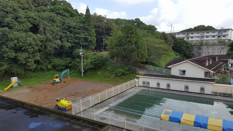 新管理棟建設に伴い、工事車両の通行上、体育館前のロータリーも撤去されました。