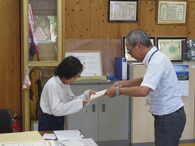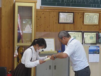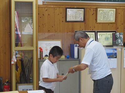午後のオンライン全校集会では、8月22日に行われた「牧水かるた大会」で個人の部4位、5位に入賞した6年生2名を表彰するとともに、初心者の部で3位になった3年生に記念品を渡しました。