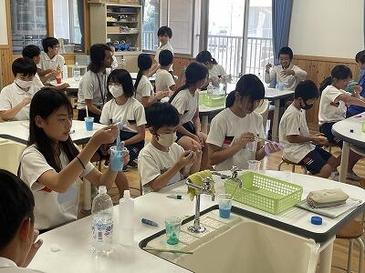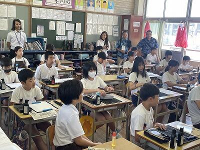 10月9日(木)ハワイのモミラニ小学校の6年生1名を迎えて、交流学習を行いました。夏休みに本校6年生児童が「小学生夏休みハワイ派遣」でお世話になったホームステイ先の6年生です。6年1組のメンバーと習字やスライム作りに取り組んだり、学年全体で運動会で発表するエイサーを披露したりとみんなで楽しい時間を過ごすことができました。モミラニ小学校の先生方も参観に来られました。