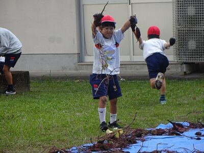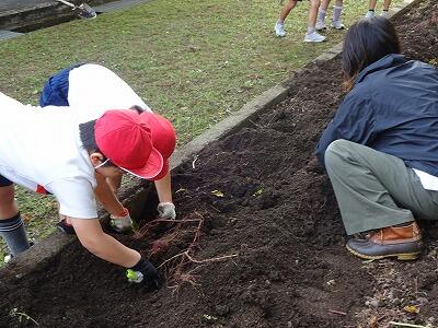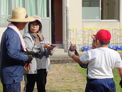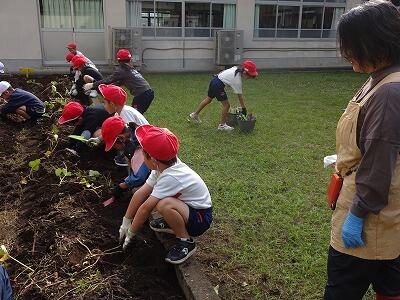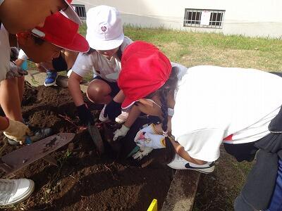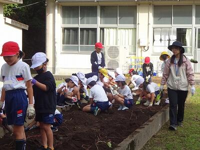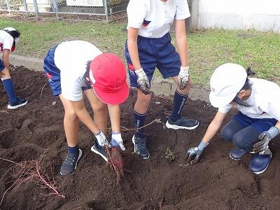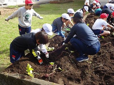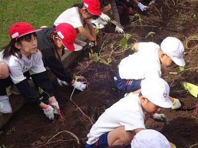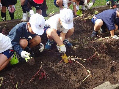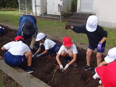 10月30日(木)2年生は生活科で育てていたサツマイモを収穫しました。事前にイモのつるを技術員さんたちが切ってくれていて、今日も子どもたちが教室から出てくる前に、地域の協力者の方がイモを掘りやすいように栽培園の土を耕してくださっていました。協力者の方に教えていただきながら、スコップや手でイモの周りの土を丁寧に掘りながら、ちょうどいいぐらいの大きさのイモを収穫することができて大喜びの子どもたちでした。