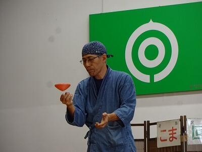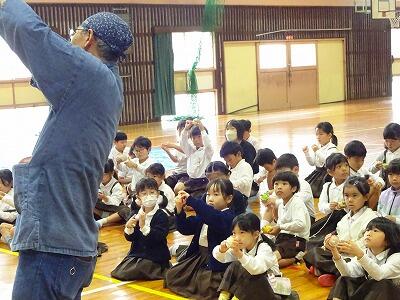 11月5日(火)3校時、1年生は体育館で生活科「むかしのあそびにちょうせん」の授業がありました。今日は鹿児島から「日本こままわし協会段位認定員」でいらっしゃる『こまのミゾさん』(ご出身はこちら)を先生にお招きして教えていただきました。はじめにこまのいろいろなスゴ技をご披露いただきました。1年生から至るところで歓声が上がっていました。そのあと、実際にこまの回し方について丁寧に教えていただきました。難しかったですが、上手に回せた1年生もたくさんいました。とても楽しい時間をありがとうございました。