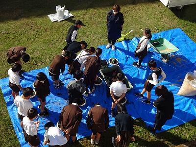 11月20日(水)2校時、4年生が冬から春に向けての花の苗植えに取り組みました。中庭にブルーシートを広げて、技術員さんたちから苗の植え方について教わりました。子どもたちは、準備してもらったパンジーの苗をグループごとに丸いプランターに丁寧に植えていきました。明日も別の学年が技術員さんの指導のもと、苗植えにチャレンジです。その後の世話もがんばってほしいと思います。