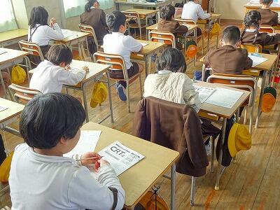 12月17日(火)3校時、1~3年生、5・6年生は「CRT(標準学力検査)国語」に取り組みました。(4年生は今月初めに「みやざき学力調査」に取り組んでいます)まずは、CDから流れるお話を聞き取る問題からスタートし、漢字の読み書き、文章の読み取りなどの問題に挑戦していきます。どの学年の子どもたちも真剣に問題と向き合っていました。明日は「算数」の予定です。