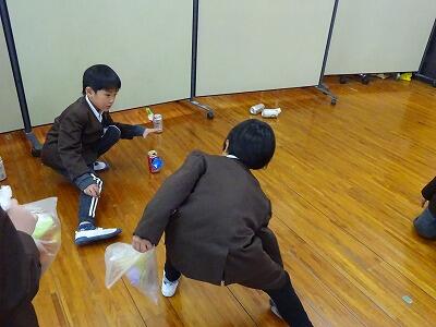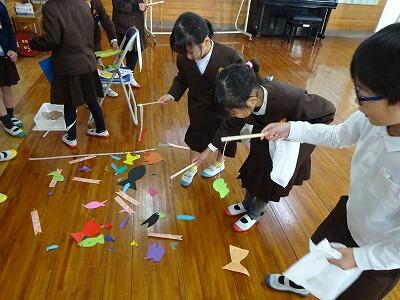 生活科の学習で2年生はこれまで、自分たちでおもちゃを作って、1年生に紹介し楽しんでもらう「おもちゃまつり」を計画、準備してきました。今週はいよいよ本番です。多目的ホールの「おもちゃまつり」会場に1年生を招待して、いろいろと工夫しながら楽しんでいる様子が見られました。