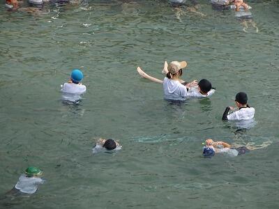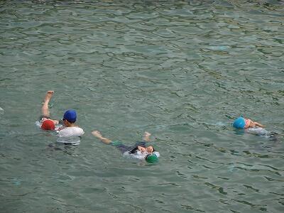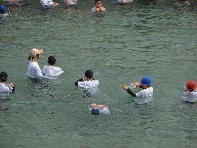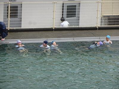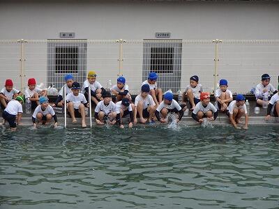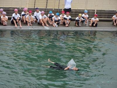 7月14日(月)1校時、プール最終回の4年生は先週から延期していた着衣泳に挑戦しました。衣服を着た状態での水の抵抗を体験し、浮いて助けを待つ方法を学ぶことがねらいです。まず、初めに袋やボールを使って体を浮かせるお手本を見た後、体育服のまま水の中に入り、ペットボトルを使っての着衣泳にチャレンジしました。今後、水辺に行った際に、この学習を思い出してほしいです。明日は6年生でも行います。