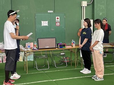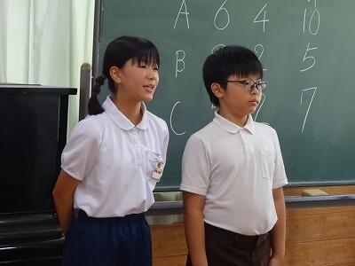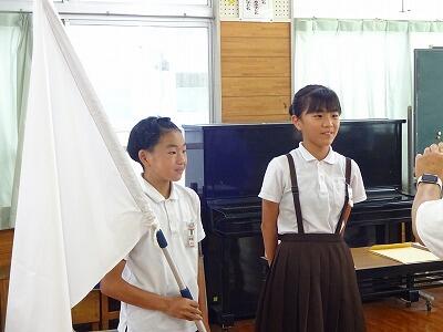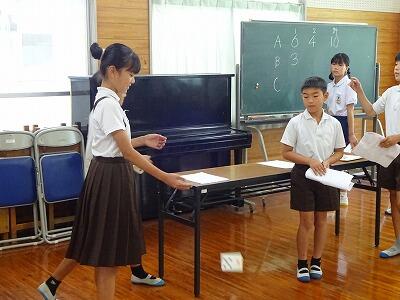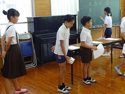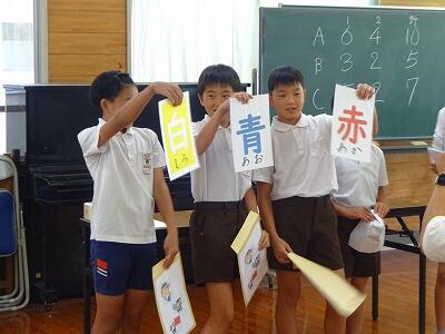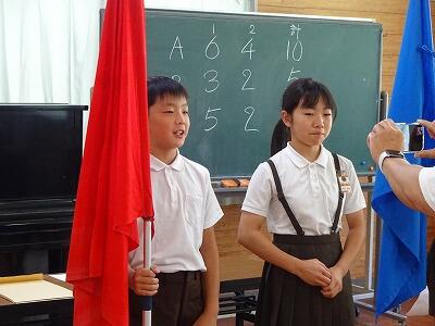 7月17日(木)2校時、10月開催予定:秋季大運動会の結団式を行いました。多目的ホールと教室をオンラインでつなぎ、体育委員会の児童が進行してくれました。まずは各団長と副団長がサイコロを振って出た目の合計の多い団から、団の色を決定する袋を選びました。「せーの」で一斉に色の描かれたカードを出すと歓声が上がりました。最後に団長、副団長があいさつをして終了しました。練習本番は2学期に入ってからですが、これからの各団のチームワークが楽しみです。