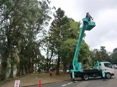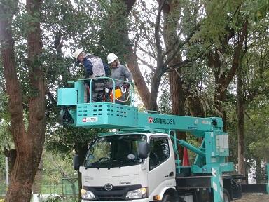 先日の奉仕作業や子ども達、教職員の作業で、台風14号の被災箇所はほとんど片付いたのですが、まだ作業ができなかったところが残っていました。本校は希望の森という背の高い木々(広葉樹)がたくさんあり、その木々の背の高い場所にかなり枝折れが見られ、その大きな枝を取り除くことができずにいました。そこで、市の依頼を受けたシルバー人材の方々が大きな機材を携えて作業をしてくださいました。これで、木々の下で安心して子ども達が遊べるようになりました。