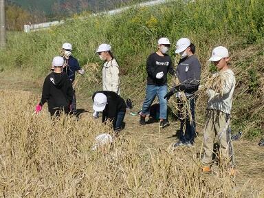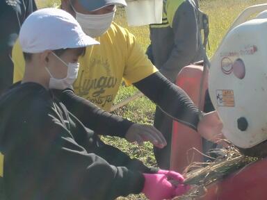 6月に塩見地区の奈須さんから田んぼをお借りして、5年生が稲作を行ってきました。その稲刈りの季節になり、20日(木)に稲刈りを行いました。ほとんどの児童が初めてとあって、「なかなか切れないなあ。」「この機械で稲穂を取るんだね。」などの声が聞かれ、一生懸命刈り取りました。