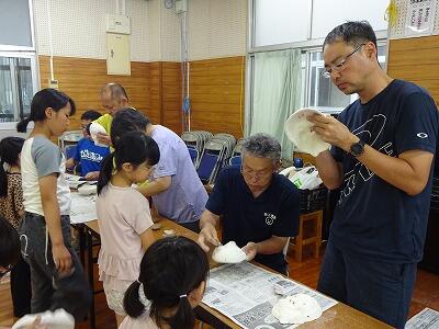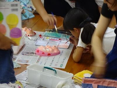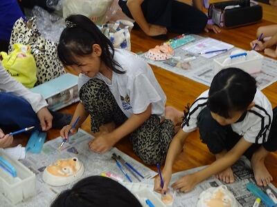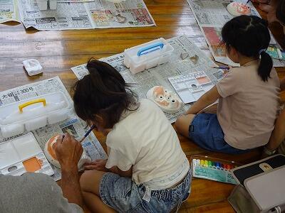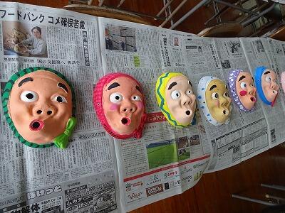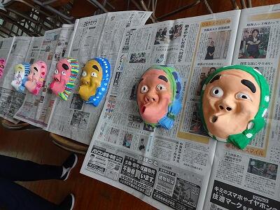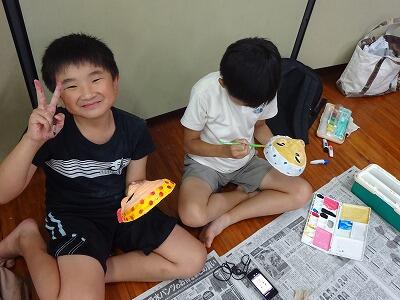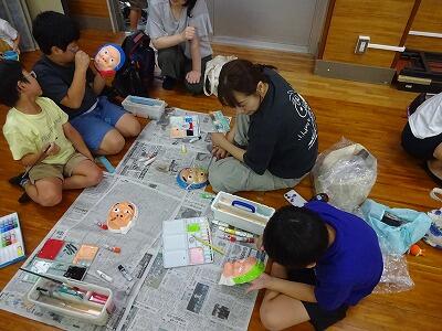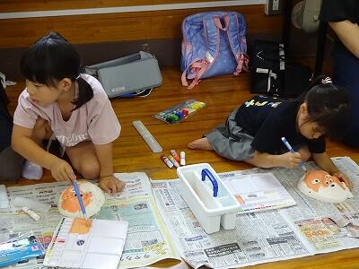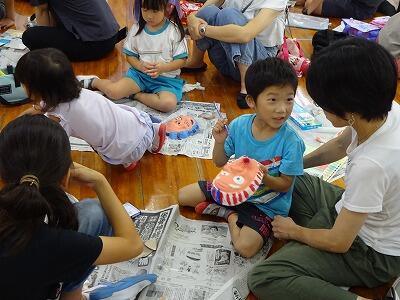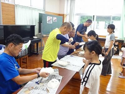 7月12日(土)”富小てんてこてん”2回目の活動日です。前回(2週間前)型取りをした紙ねん土のお面をペーパーで整え、色をぬっていきます。今回もたくさんの地域の指導者の方がサポートしてくださいました。お面の色ぬりということで、今回も保護者の方がたくさん来てくださいました。今年もユニークなお面に仕上がっていて楽しみです。