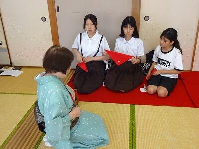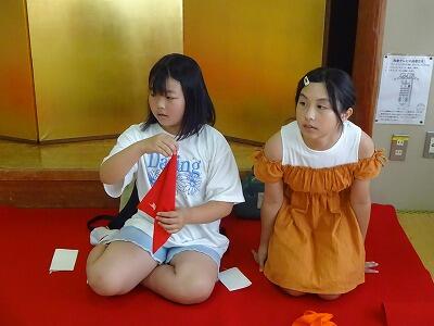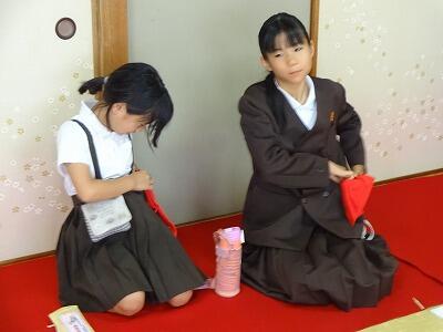 7月13日(日)午前10時から、日向市中央公民館で「夏のお茶会」が開催されました。このお茶会には「茶道クラブ」で活動している子どもたちの中から4・5・6年生7名が参加しました。まずは、富島高校茶道部の皆さんが点ててくれたお茶をいただきました。その後は、いつもお世話になっている茶道の先生のご指導のもと、お茶会に参加してくださる方のおもてなしのお手伝いをしました。普段できない貴重な体験をし、多くの学びがあったことと思います。