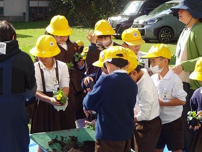 11月21日(木)今日もいくつかの学年が、学校技術員さんの指導のもとパンジーの苗をプランターに植えていました。写真は2年生の活動の様子です。