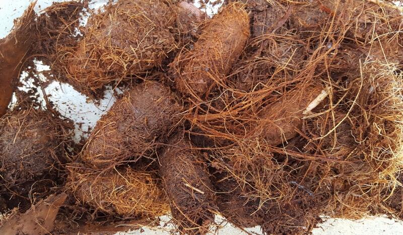 枯れて落ちたフェニックスの枝の根元から、多数のヤシオオオサゾウムシのさなぎも発見しました。