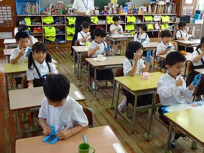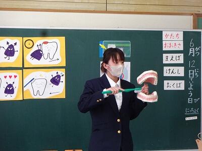 6月12日(水)1の1で養護教諭教育実習の実習生授業がありました。学級活動でテーマは「はのおうじさまをまもろう」、歯が生え替わり、6才臼歯(歯の王子様)も生えてくる1年生の子どもたちに、磨き残しのない丁寧な歯みがきの大切さをいろいろな資料を使いながら指導しました。1年生の子どもたちの反応もとてもよかったです。