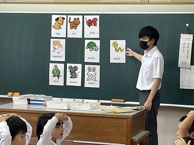 10月31日(木)2校時、1年1組では外国語の授業が行われていました。ALTの先生といっしょに動物の名前の英語での言い方について学習していました。先生の発音をまねして、元気いっぱいいろいろな動物の言い方にチャレンジしていました。後半はキーワードゲームというALTの先生が最初に選んだ動物を言った時にだけ机の消しゴムにタッチするアクティビティを2人組になって楽しんでいました。