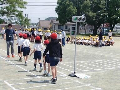 運動場では、各学年部毎に交通教室を開催しました。交通安全協会の方々が自転車や歩行者の正しい動きについて教えてくださいました。みんな、実際に自転車に乗ったり歩いたりして、真剣に横断歩道の渡り方を確認していました。