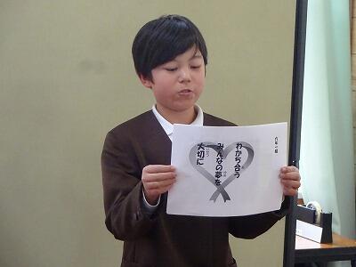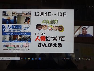 12月4日~10日は人権週間でした。12月19日(金)3校時、本校では人権集会を行いました。当初は人権週間中に体育館に全校児童が集まっての実施を計画していましたが、感染症予防のため期日をずらしてオンラインでの開催となりました。はじめに人権教育担当から「人権とは」についての話があり、その後、各学級代表が人権に関する標語を発表しました。どれも心温まる、そして勇気をもらえる標語ばかりでした。誰もが自分らしく生きられる、そんな社会のために子どもも大人も今できることに取り組んでいけたらと思います。