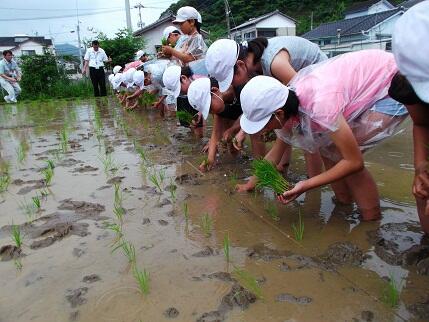 子どもたちの中には、初めて田植えをする子どもも多く、楽しみながら一つ一つ丁寧に植えていました。やや小雨の降る中、無事に終えることができ、今後は、成長していく稲を楽しみに観察しながら、また収穫後の餅つきを楽しみにしながら、大切に育てていくよう子どもたちに話をしました。