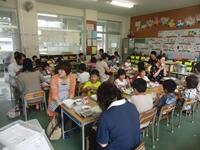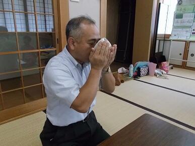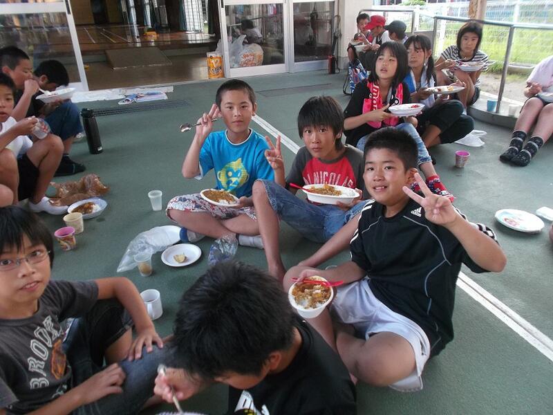 写真は、自分たちが作ったカレーを食べている満足そうな