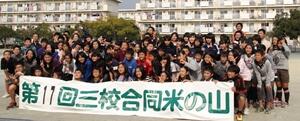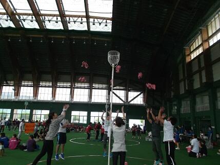市内小中学校の単PTAの代表チームが、日向サンドームに集まり、玉入れ競争しながら親睦を深めました。