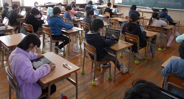 タブレット端末を使って、漢字の練習をしていました。とめやはねもしっかりしないとまるがもらえません。人間より厳しいかも。みんなだまって、真剣に取り組んでいました。