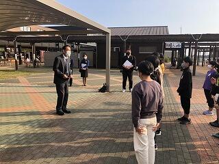 博物館が最後の見学場所となっていたため、その後は高速道路を使って日向へと向かいました。途中、川南パーキングエリアで、感謝の集いを行いました。感謝の集いでは、2日間お世話になった添乗員さん、バスガイドさん、ドライバーの方、カメラマンさんに感謝の言葉と色紙を贈りました。