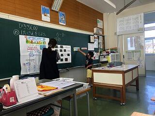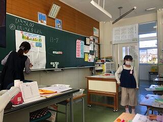 という先生の問いかけに、勇気出して手を挙げた子どもが実際に洗濯物たたみにチャレンジして拍手喝采を受けていました。(たたんでいる様子は実物投影機で大型テレビに投影)また、算数「ひきざん(2)」の授業では、繰り下がりのある引き算の学習に取り組みました。おうちの方が参観してくださっているので、いっしょうけんめい計算に取り組んでいました。