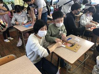 3年生は、図工「くぎうちトントン」という学習に親子で2時間取り組みました。この「くぎうちトントン」では、板に釘を打ってコリントゲームを作りました。最初のうちは、釘の打ち方で苦戦していましたが、保護者の手助けもあって、だんだん上手に打てるようになっていました。