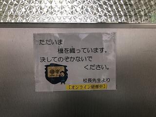 コロナ禍ということもあり、出張の一部がオンライン研修となるケースが増えてきています。先週、校長室の前にオンライン研修中の表示がしてありました。しかし、よく見てみると・・・