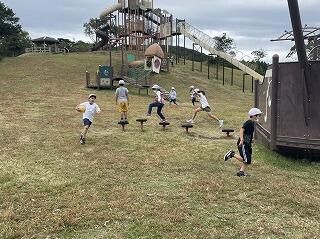 2年生は、秋晴れの下、大型遊具で仲よく楽しく遊ぶことが出来ました。まだ、リニューアル後のサンパークを体験されていらっしゃらない方は是非ご家族でお出かけください。