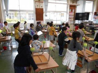 4月26日の清掃時間に、1年生が清掃の練習をしていました。具体的には、椅子を机の上に載せる練習、机を移動させる練習などに取り組んでいました。