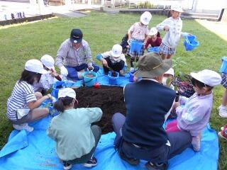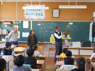 5月9日の1・2時間目、2年生が生活科「大きく育て私の野菜」の学習をしていました。この日は、地域の安全監視員の方や本校児童の祖父母の方3名が来て、野菜の育て方の話をしたり、野菜の苗植えを手伝ったりしてくださいました。