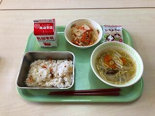 メニューは、いつもの牛乳に加えて、ちらしずし、レンコンのすみそあえ、すましじる、さらにひなあられが付いていました。子どもたちは、いつも違うメニューに大喜びしていたようです。
