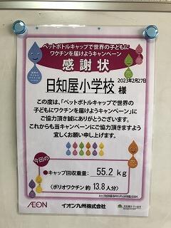 今年度も55.2㎏のキャップを回収することができ、先日担当者がイオン日向店に届けました。これは、ポリオワクチン約13.8人分に相当する量だそうです。イオン九州(株)より、「ペットボトルキャップで世界の子どもにワクチンを育てようキャンペーン」の感謝状が届き、さっそく回収場所に掲示しました。