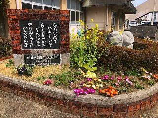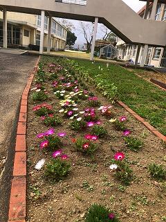 本校では、技術員と技術員補助の先生方が、こつこつと花を育ててくださっています。現在、中庭の花壇やプランターにパンジーやデイジーなど、色とりどりの花が咲いています。花によっては、種から育てて手を掛けながら大事に世話をし、きれいな花を咲かせるまでに至っています。
