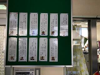 その力作を職員室前の廊下に掲示しています。靴箱の前ということもあって、イラスト作品の前に人だかりができることもあります。