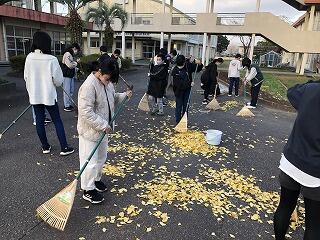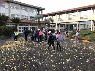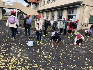 この時期、イチョウの葉が落ちて、中庭はイチョウの絨毯状態となります。そこで、登校してきた子どもたちは、イチョウの葉を5枚バケツに入れて教室に上がります。今朝は、6年生がボランティアとしてイチョウの葉を集めてくれました。