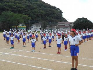 9月30日の1時間目、運動場で1回目の運動会全体練習を行いました。この時間は、開会式と退場までの練習を行いました。