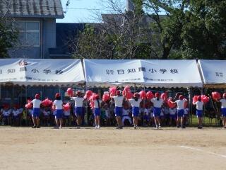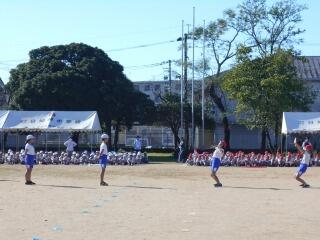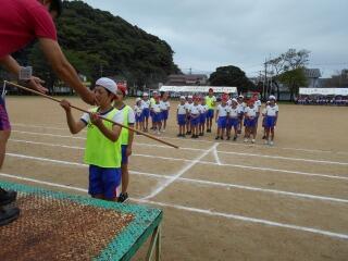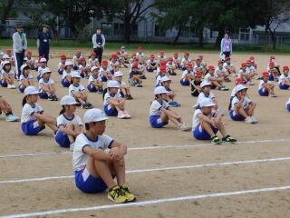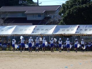 10月9日の午前中、全校児童が運動場で運動会の予行練習を行いました。