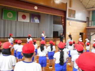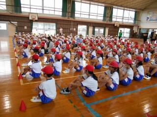 10月4日の1時間目、体育館で運動会全体練習の2回目を行いました。計画では、運動場で行う予定だったのですが、雨天のため体育館で行いました。
