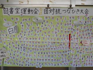 今、図書室前で「団対抗つなひき大会」が行われています。これは、図書室の本を1冊読んだら、子どもの絵が描かれたカードを1枚もらい、自分の団に貼っていくものです。当然、つなを引く人の数が多いほど勝ちに近づくということになります。