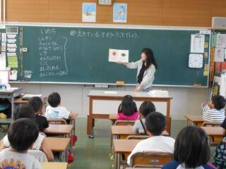 10月11日の2時間目、1年生が学級活動で「命の大切さ」について考える授業をしていました。この日は、読み聞かせの活動をしていらっしゃる方に来ていただいて、命に関わる本を2冊読んでいただきました。